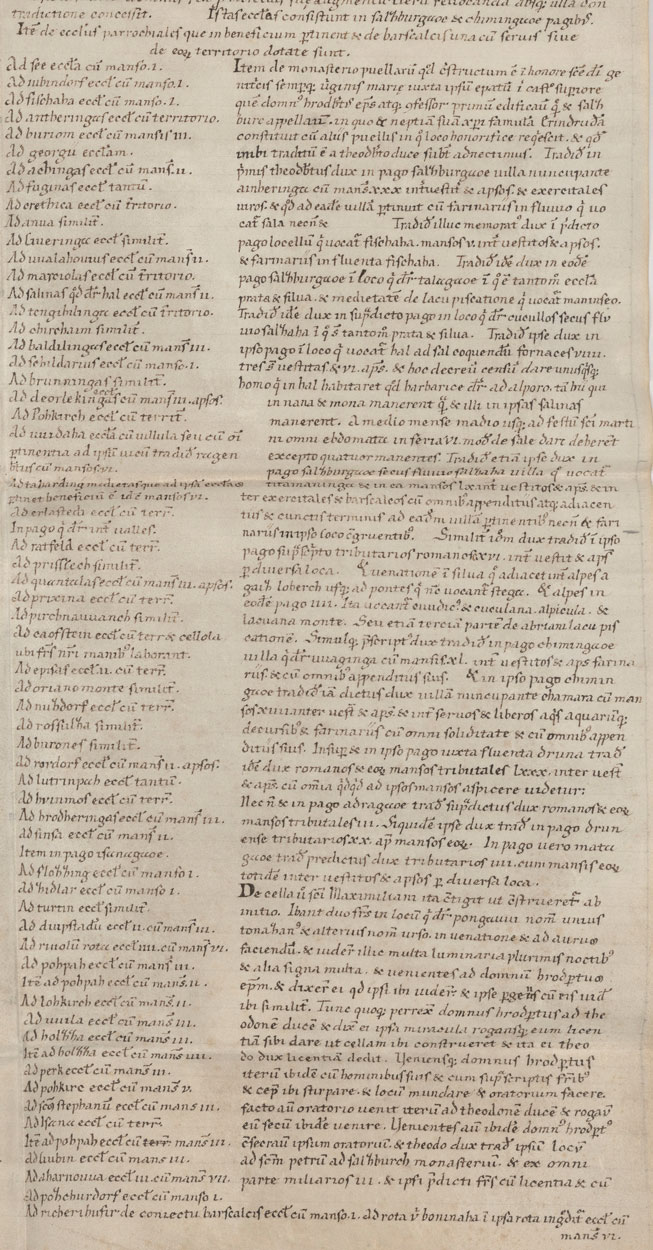 Ausschnitt aus der Abschrift der Notitia Arnonis aus dem 12. Jahrhundert. (Bayerisches Hauptstaatsarchiv, HL Salzburg 21a)