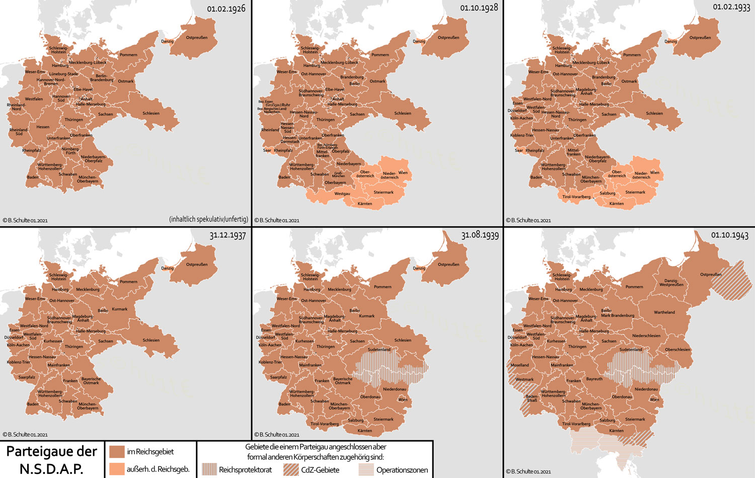 Parteigaue der NSDAP von 1926 bis 1943. (Quelle: Bennet Schulte, lizenziert durch CC-BY-SA-3.0-DE via Wikimedia Commons) HLB