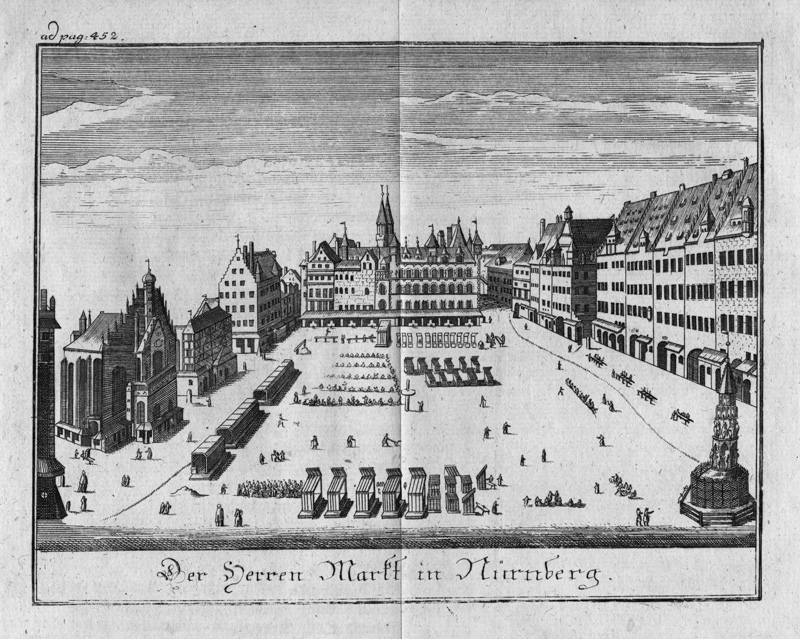 Der Nürnberger Hauptmarkt diente als Umschlagplatz für die verschiedensten Waren, Ansicht des Nürnberger Hauptmarktes, Stich um 1750, aus: Johann H. v. Falckenstein: "Wahre und Grund haltende Beschreibung der heutiges Tages weltberühmten Des heiligen Römischen Reichs Freyen Stadt Nürnberg. Das vierte Buch". (Bayerische Staatsbibliothek, Bildarchiv port-000606) Vom Eigentümer zur Verfügung gestellt