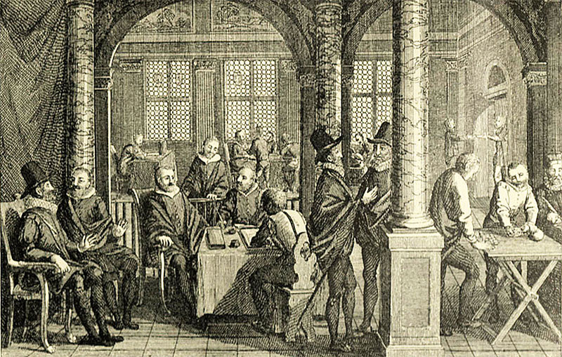 Die Nürnberger Banco publico wurde 1621 errichtet. Als öffentliche Einrichtung der Stadt befand sich die Banco Stube im Rathaus. Druck nach einem Stich von G. W. Küffner aus dem Jahre 1800. Abb. aus: Hugo Barbeck: Alt-Nürnberg. Kulturgeschichtliche Bilder aus Nürnbergs Vergangenheit, Bd. 7: Kaufmann und Handel, Nürnberg 1896, Blatt 7. (Bayerische Staatsbibliothek, 2 Bavar. 32 v-6/10)
