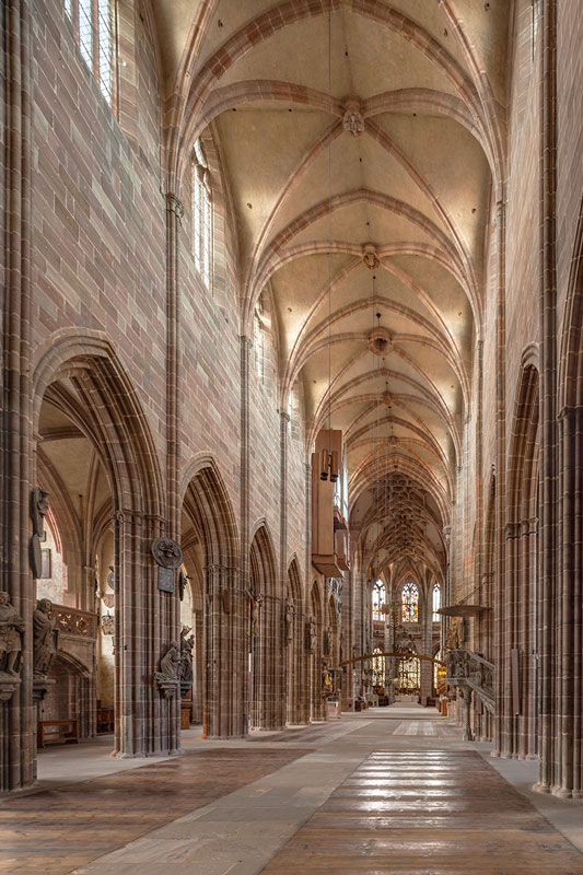 St. Lorenz, Innenraum nach Osten, Blick vom hochgotischen Langhaus zum spätgotischen Hallenchor. Anschaulich der archaische Wandaufriss des Langhauses mit seinen geschlossenen Wandflächen zwischen Arkaden und Obergadenfenstern. Aufnahme 2015. (Foto: Thomas Bachmann)