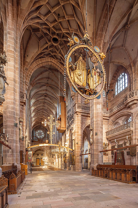 St. Lorenz, Innenraum nach Westen, Blick vom Hallenchor ins basilikale Langhaus. Im Vordergrund die Rückansicht des Engelsgrußes (1517/18) von Veit Stoß unter dem Netzgewölbe des Binnenchores. Aufnahme 2015. (Foto: Thomas Bachmann)