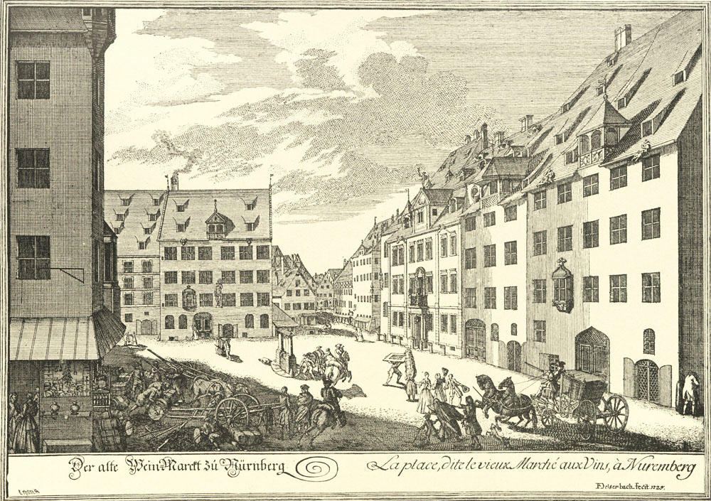 Der Nürnberger Weinmarkt am heutigen Maxplatz. Stich von Johann Adam Delsenbach (1687-1765) von 1715/16. Abb. aus: Hugo Barbeck: Alt-Nürnberg. Kulturgeschichtliche Bilder aus Nürnbergs Vergangenheit, Bd. 7: Kaufmann und Handel, Nürnberg 1896, Blatt 3. (Bayerische Staatsbibliothek, 2 Bavar. 32 v-6/10)