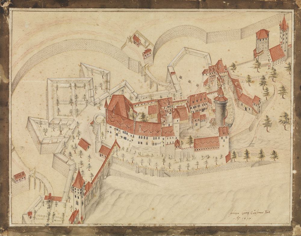 Ansicht der Kaiserburg von Süden. Johann Georg Erasmus (1659-1710), 1677. (Germanisches Nationalmuseum Nürnberg, Gm 1084/St. N. 16956)