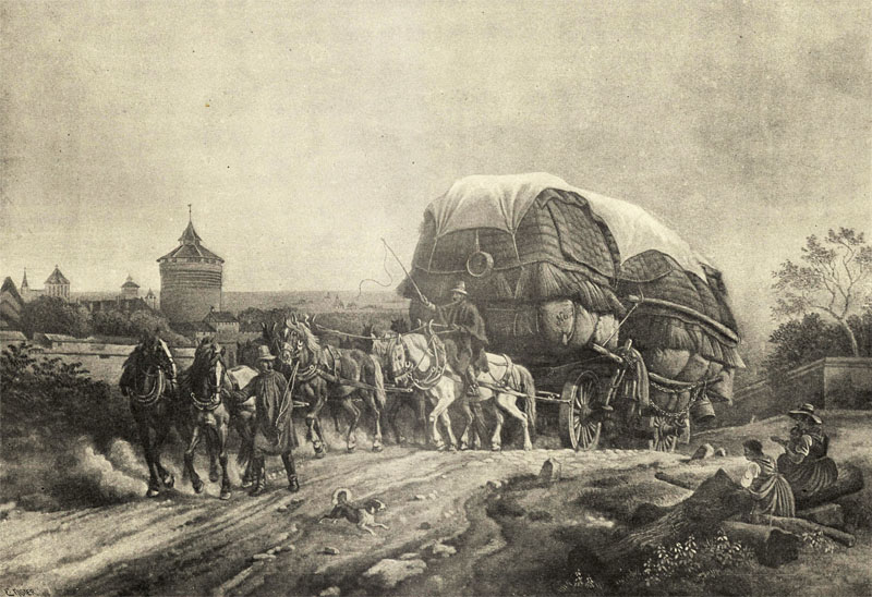 Ein Frachtwagen vor dem Nürnberger Neutor. Ölgemälde von Johann Adam Klein (1792-1875). Abb. aus: Hugo Barbeck: Alt-Nürnberg. Kulturgeschichtliche Bilder aus Nürnbergs Vergangenheit, Bd. 7: Kaufmann und Handel, Nürnberg 1896, Blatt 12. (Bayerische Staatsbibliothek, 2 Bavar. 32 v-6/10)
