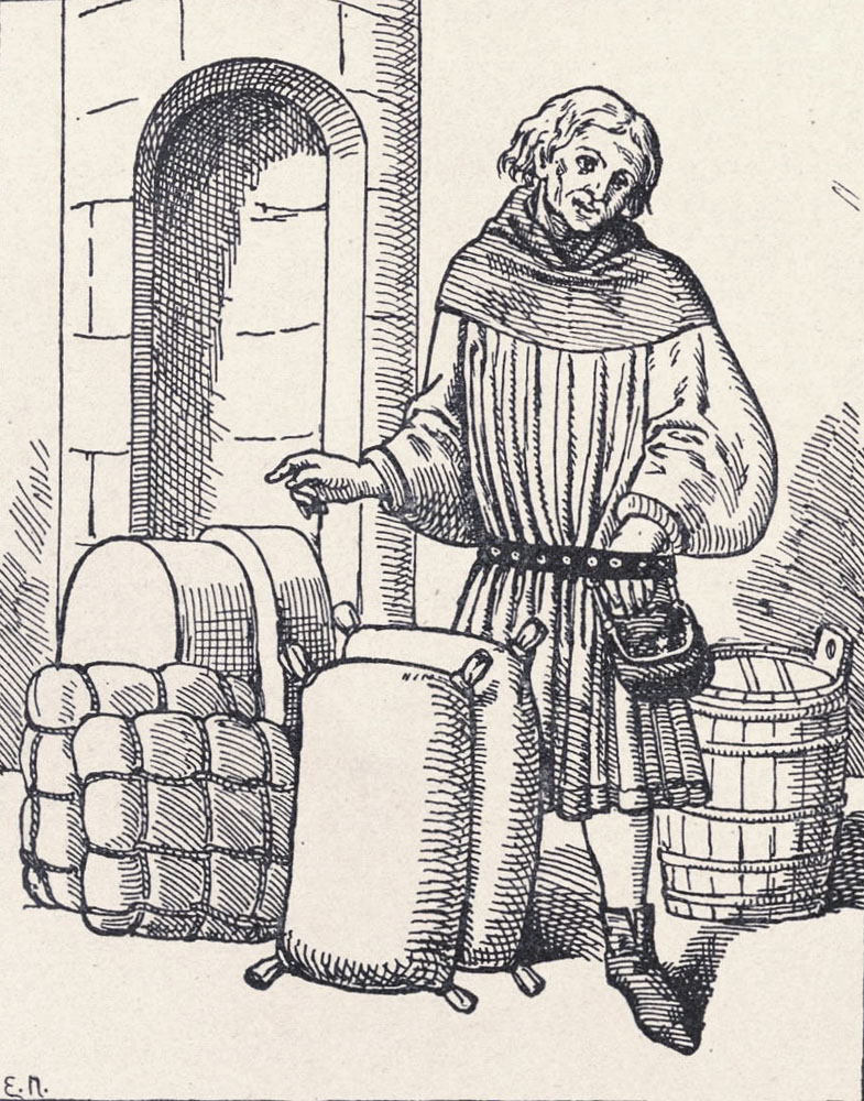 Nürnberger Kaufmann, 1426. Druck nach einer Darstellung im Hausbuch der Mendelschen Zwölfbrüderstiftung, Band 1, Nürnberg 1426-1549. Abb. aus: Hugo Barbeck: Alt-Nürnberg. Kulturgeschichtliche Bilder aus Nürnbergs Vergangenheit, Bd. 7: Kaufmann und Handel, Nürnberg 1896, Blatt 5. (Bayerische Staatsbibliothek, 2 Bavar. 32 v-6/10)