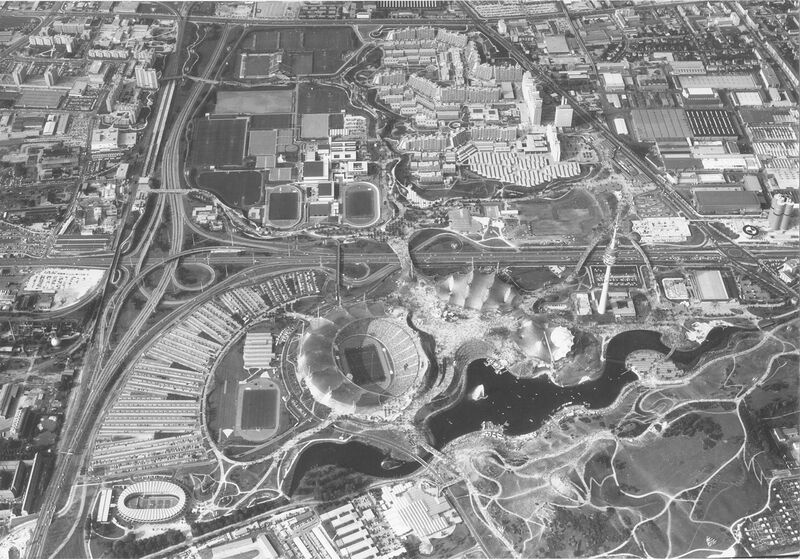 Lufbild des Olympia-Geländes während der Sommerspiele 1972. Foto von Max Prugger (1918-2003). (Bayerische Staatsbibliothek, Bildarchiv pru-000013) HLB