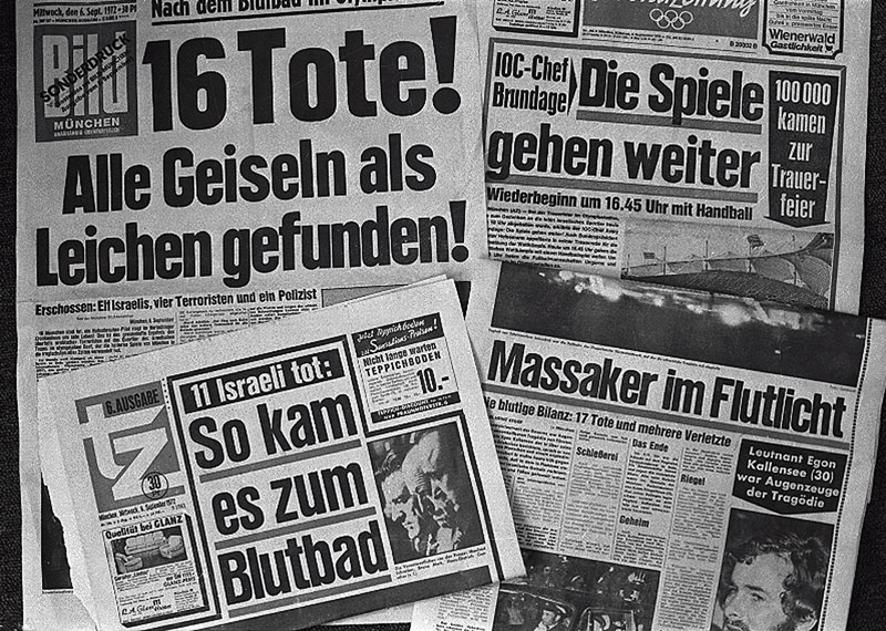 Schlagzeilen der in München erscheinenden Boulevardzeitungen (im Uhrzeigersinn) BILD München, Abendzeitung und tz zum Terroranschlag auf die israelische Olympiamannschaft 1972. Ausgaben vom 1. September 1972. (Interfoto, Mediennummer: 01966828) HLB