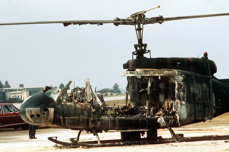 Das Bild vom 07.09.1972 zeigt den ausgebrannten Hubschrauber, in dem in Fürstenfeldbruck ein Teil der von palästinensischen Terroristen festgeha​ltenen Geiseln ums Leben kamen. (dpa/Süddeutsche Zeitung Photo) HLB