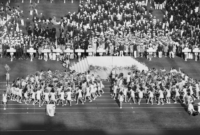 Die Eröffnungsfeier der 50. Olympischen Sommerspiele fand am Nachmittag des 26. August 1972 statt. Auf dem Bild ist der traditionelle Gruß der Jugend, dargeboten von 3500 Münchner Schulkindern mit selbstgebundenen Bögen und Blumensträußen zu sehen. Foto von Karsten de Riese (geb. 1942) (Bayerische Staatsbibliothek, Bildarchiv rie-000029) HLB