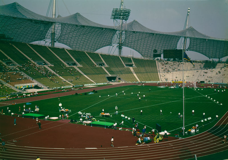 Das fertiggestelle Olympiastadion mit der luftigen Zeltdachkonstruktion während der Leichtathletikwettbewerbe 1972. Foto von Joachim Kankel (1921-1984). (Bayerische Staatsbibliothek, Bildarchiv kank-0002832) HLB