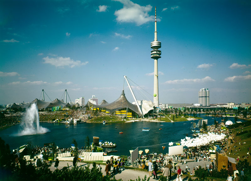 Blick auf das Olympiagelände während der Spiele 1972. Im Vordergrund ist die Spielstraße zuerkennen. Foto von Joachim Kankel (1921-1984). (Bayerische Staatsbibliothek, Bildarchiv kank-000268) HLB