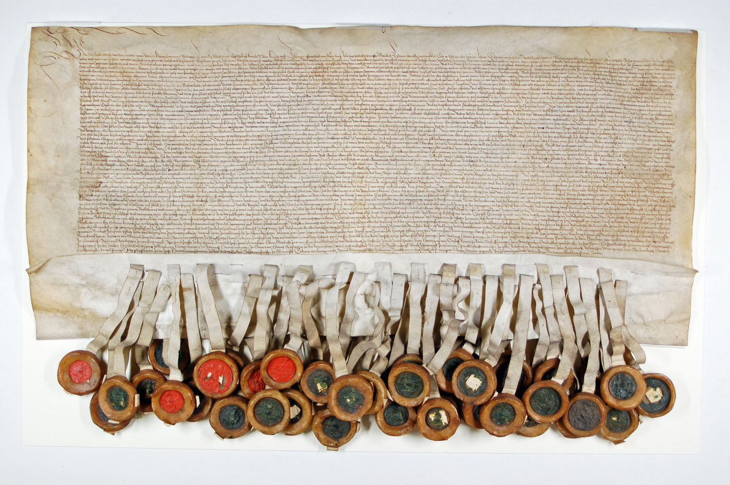 Die Ordnung der Gesellschaft vom Löwen, ausgestellt in Cham am 14. Juli 1489. (Staatsarchiv Amberg, Fürstentum Obere Pfalz, Regierung Urkunden 549)