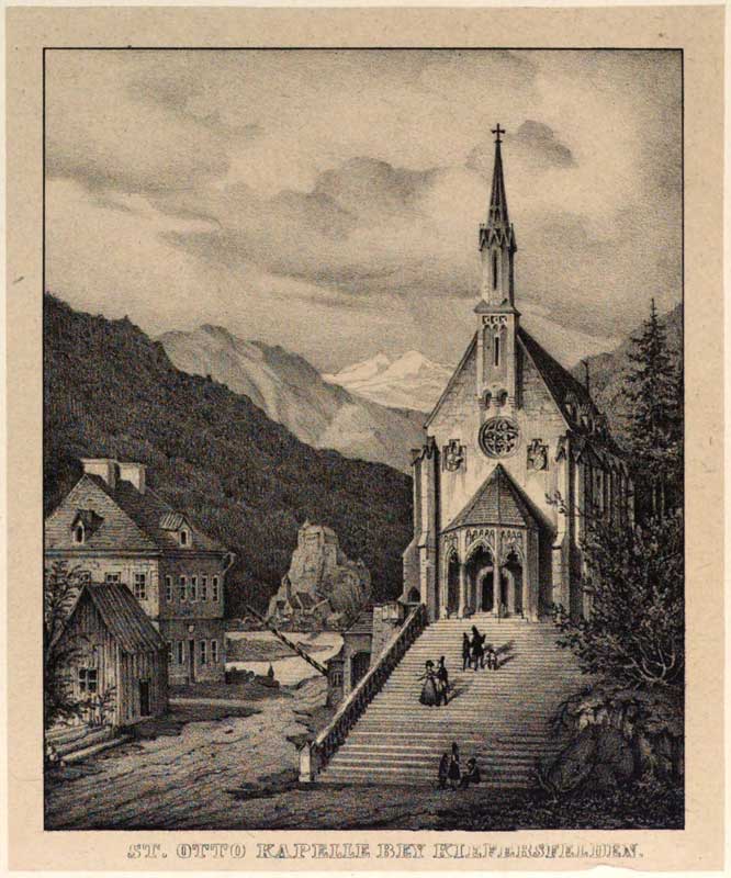 Die Otto-Kapelle bei Kiefersfelden wurde an der Grenze Bayerns zu Tirol zwischen 1834 und 1836 als neogotische Kapelle zur Erinnerung an den Abschied Ottos (1815-1867) von seiner Heimat errichtet. Abbildung aus: Erinnerungen an die feierliche Grundstein-Legung zur Otto-Kapelle bei Kiefersfelden, als National-Denkmal des Abschiedes Seiner Majestät des Königs Otto von Griechenland vom bayerischen Vaterlande, am 1. Juni 1834, München 1834. (Bayerische Staatsbibliothek, 4 Don.Lud. XI,14) HLB