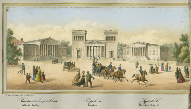 Panorama des Königsplatzes um 1864. Abb. aus: "Illustrirter Spaziergang durch München. Ein Panorama der bedeutensten Strassen, Plätze und Gebäude", München 1864. (bavarikon) (Bayerische Staatsbibliothek, Bildarchiv port-025402) HLB