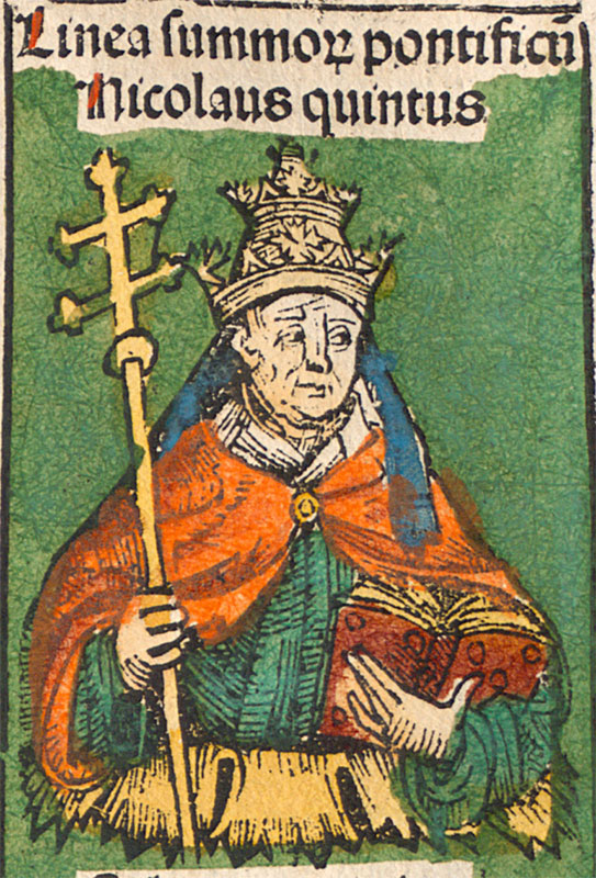 Darstellung von Papst Nikolaus V. (reg. 1447-1455) von 1493. Abb. aus: Hartmann Schedel, Liber Chronicarum, Nürnberg 1493, fol. 296v. u. 89r. (bavarikon) (Bayerische Staatsbibliothek, 2 Inc.c.a. 2919)