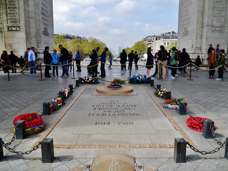 Das Grabmal des unbekannten Soldaten in Paris befindet sich unter dem Arc de Triomphe. Es wurde am 11. November 1920 eingeweiht. (Foto von Zairon, lizenziert durch CC BY-SA 4.0 via Wikimedia Commons) HLB
