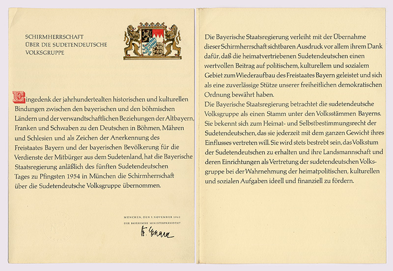 Nach dem Zweiten Weltkrieg übersiedelten im Rahmen von Flucht und Vertreibung rd. 1 Mio. Menschen aus dem sog. Sudetenland dauerhaft nach Bayern über. Die sudetendeutsche Volksgruppe stellte damit mehr als die Hälfte aller Flüchtlinge und Vertriebenen in Bayern. Am 6. Juni 1954 verkündete der bayerische Ministerpräsident Hans Ehard (CSU, 1887-1980, Ministerpräsident 1946-1954 und 1960-1962) auf dem 5. Sudetendeutschen Tag die Übernahme der Schirmherrschaft über die Sudetendeutschen durch den Freistaat Bayern. Die damals nur ausgesprochene Schirmherrschaft wurde am 7. November 1962 förmlich verbrieft. (Bayerisches Hauptstaatsarchiv, SdA: Patenschaftsurkunden 1)