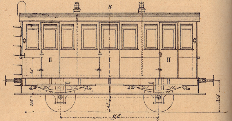 Personenwagen 1. und 2. Klasse 1857. Abb. aus: Theodor Lechner, Die Privat-Eisenbahnen in Bayern. Eine Betrachtung nach der geschichtlichen, technischen und wirtschaftlichen Seite, München und Berlin 1920, 112. (Bayerische Staatsbibliothek, 4 Bavar. 3139 o HLB