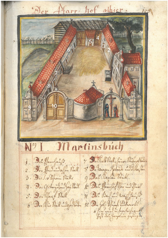 Darstellung eines Pfarrhofs mit Wirtschaftsgebäuden im sogenannten "Hausbuch" der Pfarrei Martinsbuch (Lkr. Dingolfing-Landau), das der dortige Pfarrer Franz Xaver Prechtl (1741-1803) im Jahr 1793 anlegte. Legende: 1. Pfarrhaus; 2. Pferde- und Ochsenstall; 3. Schweineställe; 4. Getreide- und Heustadl; 5. Schafstall; 6. Kuhstall und Gsodboden (d.h. Futterspeicher); 7. Kalbstall und Hühner-Stube/Boden; 8. Wagen-Retrade (d.h. etwa Garage) und Kasten; 9. Kaplan-Stübl; 10. Pfarrhof-Tor. (Bischöfliches Zentralarchiv Regensburg, Pfarrmatrikel Martinsbuch, Bd. 39; Nummerierung nachträglich hervorgehoben)