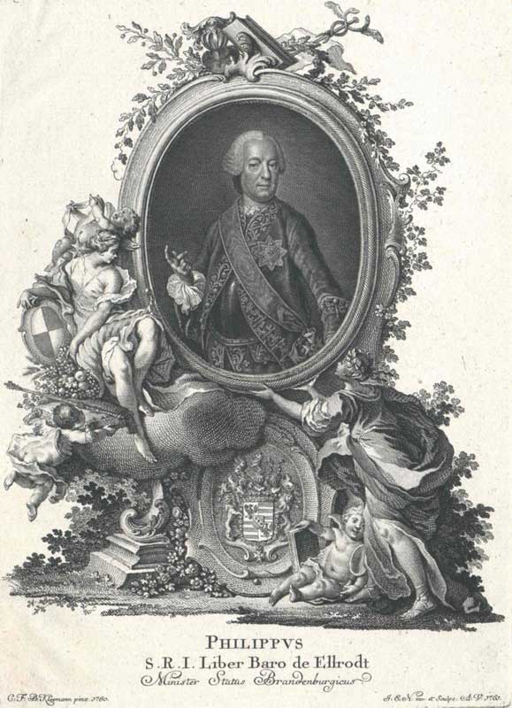 Philipp Andreas Freiherr (ab 1762 Reichsgraf) von Ellrodt (1707-1767) war leitender Minister unter Markgraf Friedrich (reg. 1735-1763). Kupferstich von 1767. (Österreichische Nationalbibliothek PORT_00124925_01)