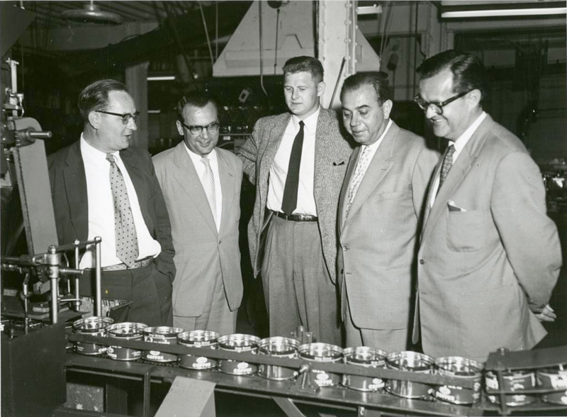 Der CSU-Politiker und Landrat des Landkreises Freising, Philipp Held (CSU, 1911-1993, Freisinger Landrat 1945-1966, MdL 1954-1974), nahm vom 11. September bis 1. November 1956 an einer Studienreise in die USA teil. Held dokumentierte seine Reise in zahlreichen Aufnahmen. Hier besichtigt er gemeinsam mit Reiseteilnehmern eine Lebensmittelfabrik (rechts im BIld: Philipp Held). Neben politischen und gesellschaftlichen Themen standen vor allem auch wirtschaftliche im Vordergrund der Studienreisen. (Archiv für Christlich-Soziale Politik, NL Held Philip 14 13) HLB