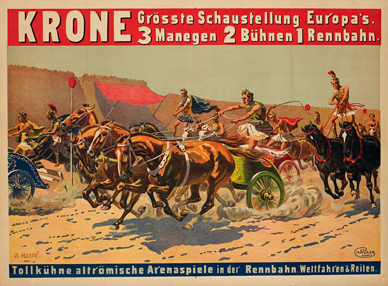 In den 1920er Jahren warb der Zirkus Krone mit tollkühnen antiken Arenaspielen in der Rennbahn. Im Gegensatz zu den antiken circensischen Spielen herrscht im modernen Zirkus jedoch nicht mehr das Prinzip des Wettkampfes, sondern des Spiels. (Plakatentwurf von Oskar Merté um 1925, Münchner Stadtmuseum, PS-09-56)