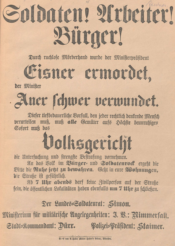 Der gemeinsame Aufruf des Stadtkommandanten, des Polizeipräsidenten, des Landessoldatenrats und des Ministeriums für militärische Angelegenheiten vom 21. Februar 1919 enthält bezeichnenderweise keinen Hinweis auf eine "Zweite Revolution", sondern auf die Volksgerichte. Das hier präsentierte Exemplar wurde laut handschriftlichem Vermerk am 21. Februar von Militärfliegern abgeworfen. (bavarikon) (Bayerische Staatsbibliothek, 2 H.un.app. 44 m)