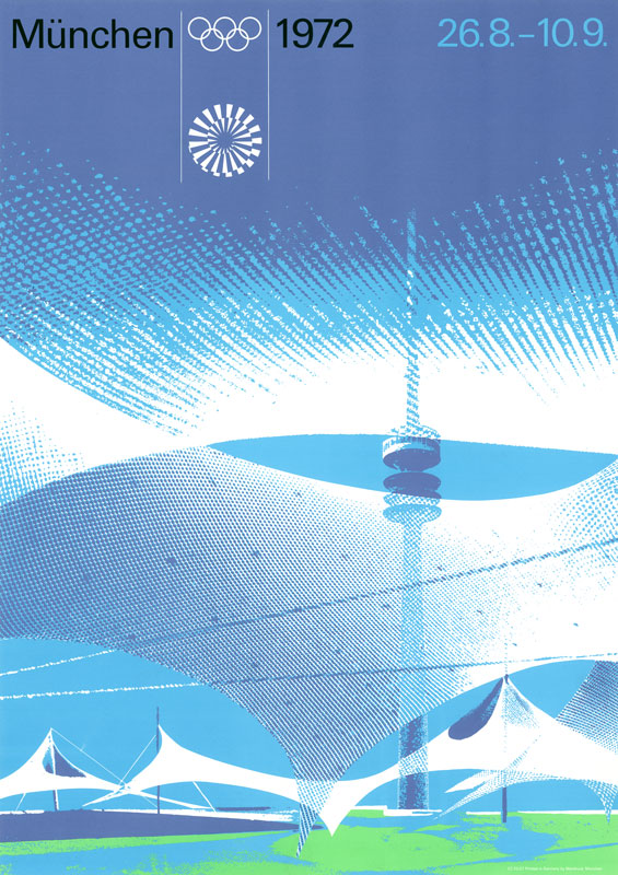 Plakat für die Olympischen Sommerspiele 1972. Gestaltung von Otl Aicher (1922–1991). Als Motiv werden hier die stilisierten Zeltdächer des Olympiaparks gezeigt. (Bayerisches Hauptstaatsarchiv, Plakatsammlung 28728) HLB