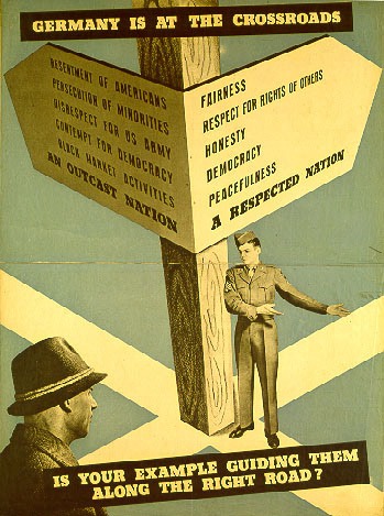 Germany at the crossroads. Original: Reeducation in occupied Germany after 1945, Plakat zur Reeducation. US-Army amerikanische Besatzungszone, um 1947 Druck 84,9 x 62,4 cm Haus der Geschichte, Bonn, Deutsches Historisches Museum, EB-Nr.: 1994/04/0331. (Gemeinfrei via Wikimedia Commons) HLB