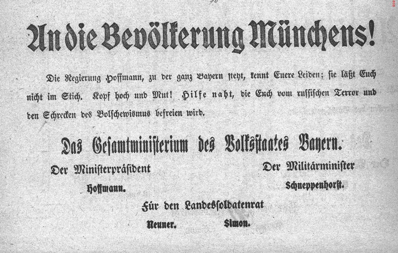 Flugblatt der Regierung Hoffmann an die Bevölkerung Münchens. Abb. aus: Sammlung von Flugblättern betreffend die Münchener Räterepublik 1919. (Bayerische Staatsbibliothek 4 H.un.app. 1071 t)