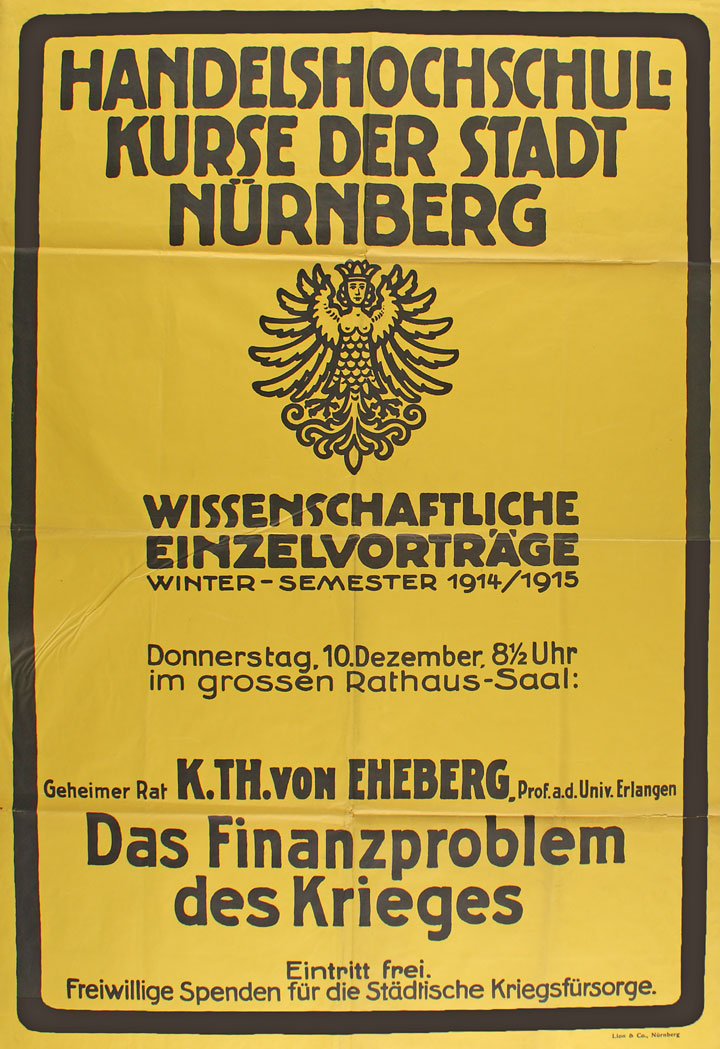Werbung für einen Vortrag von Karl Theodor von Eheberg, Nationalökonom an der Universität Erlangen, im Rahmen der Handelshochschulkurse. Plakat, 1914. (Universitätsarchiv Erlangen-Nürnberg E8/2a Nr. 1) HLB