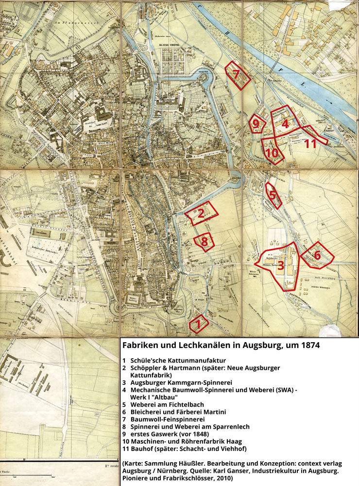 Karte mit Fabriken und Lechkanälen in Augsburg, um 1874. (Karte: Sammlung Häußler. Vorbearbeitung und Konzeption: context verlag Augsburg / Nürnberg. Quelle: Karl Ganser, Industriekultur in Augsburg. Pioniere und Frabrikschlösser, 2010) HLB