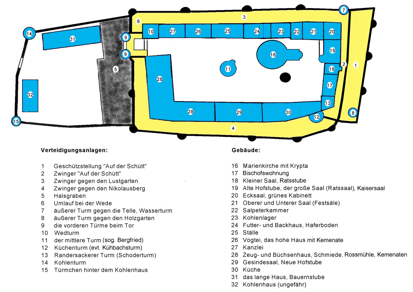 Orientierungsplan der Festung Marienberg von ca. 1525 mit schematischer Einteilung der Gebäude. (Christian Leo) HLB