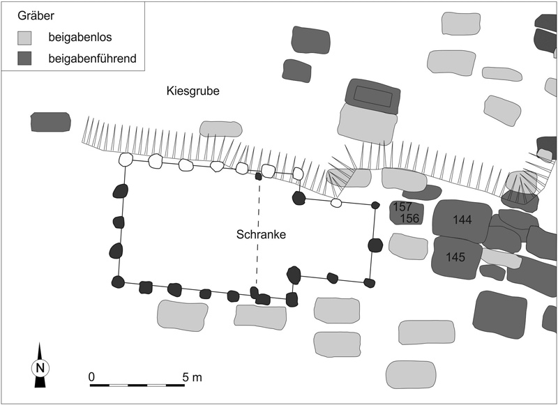 Staubing, Frühmittelalterliches Gräberfeld (Ausschnitt) mit Grundriss einer Kirche in Holzpfostenbauweise. (nach Th. Fischer 1993) HLB