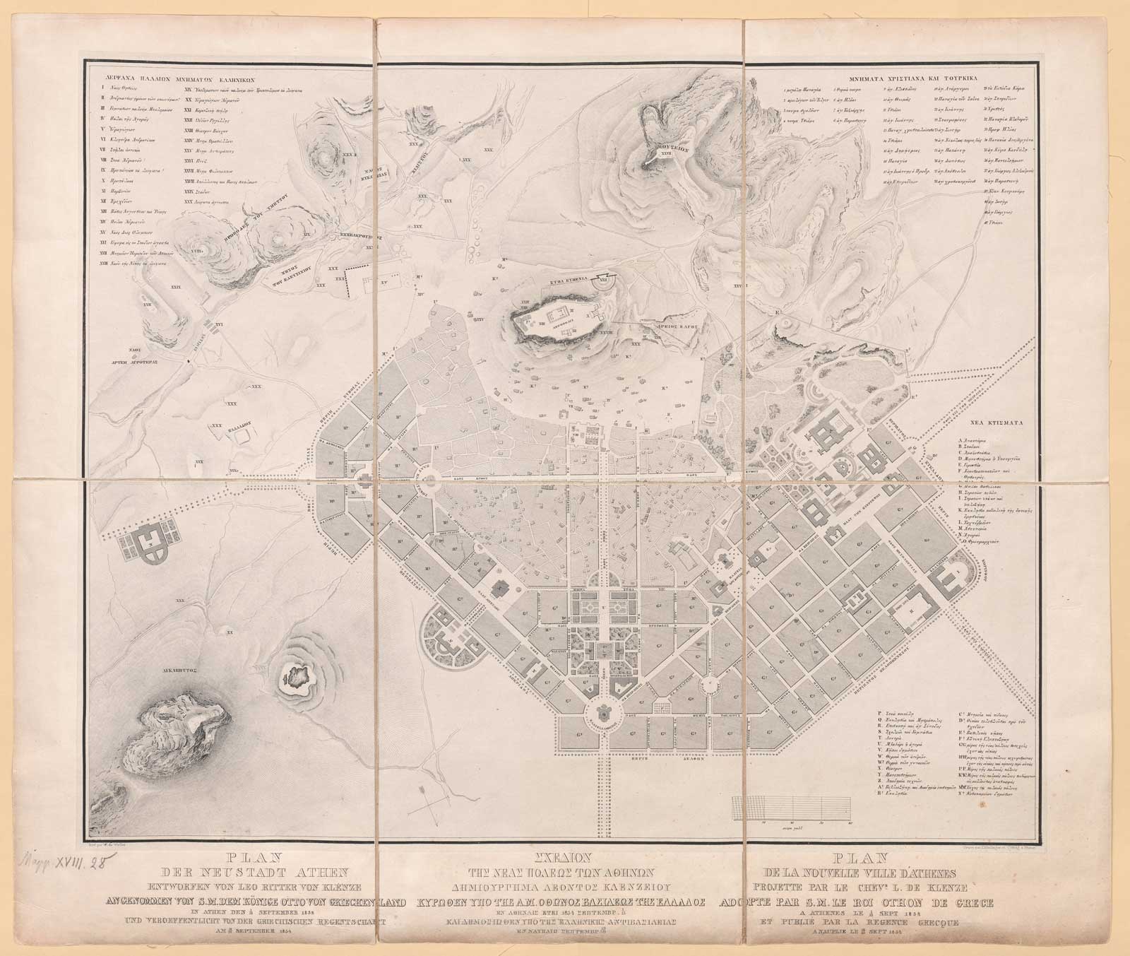 „Plan Der Neustadt Athen“ von Leo von Klenze (1784-1864), 1834. Ludwig I. (1786-1886) schickte Leo von Klenze 1834 nach Griechenland, um den Stadtplan von Eduard Schaubert (1804-1860) und Stamatios Kleanthes (1802-1862) zu überarbeiten. Der ausgearbeitete Plan wurde 1834 veröffentlicht, jedoch letztlich in nochmals veränderter Form umgesetzt (so baute man die Königsresidenz nicht, wie von Klenze vorgesehen, im Bereich des Kerameikos, sondern am heutigen Syntagma-Platz). Klenze setzte allerdings u. a. den Abzug des Militärs von der Akropolis durch, was die Ausgrabung antiker Gebäude ermöglichte. Die antiken Bauten wurden z. T. rekonstruiert (z. B. Niketempel). An dem vorgesehenen Prinzip, rund um die Akropolis Areale für archäologische Grabungen freizulassen, hielt man im Kern fest – dies zeigt sich bis heute im Athener Stadtbild. (Bayerische Staatsbibliothek, Mapp. XVIII,28) HLB