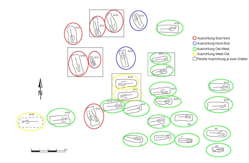 Maisach-Gernlinden (Lkr. Fürstenfeldbruck), Plan des spätrömischen Gräberfeldes mit Ausrichtung der Bestattungen. (Bayerisches Landesamt für Denkmalpflege) HLB