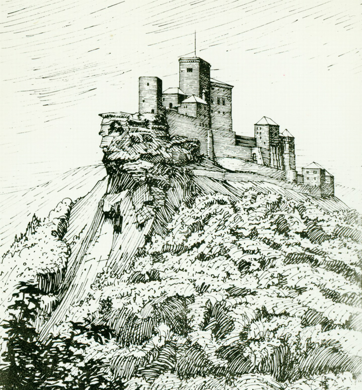 Die geplante Neugestaltung der Burg Trifels nach den Plänen von Rudolf Esterer von Südosten gesehen, Zeichnung von 1938. (Museum unterm Trifels Annweiler)