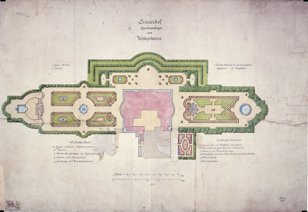 Entwurf der Gartenanlage für Schloss Linderhof von Carl von Effner (1831-1884), um ca. 1872/74. Effner wurde für diesen Park von Ludwig II. persönlich geadelt. (© Bayerische Schlösserverwaltung, Gärtenabteilung) HLB