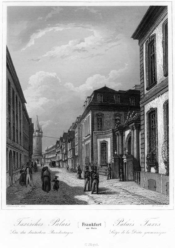Portal des Palais Thurn und Taxis an der Großen Eschenheimer Straße zur Zeit der Nutzung als Bundespalais, 1845. Stahlstich von Wilhelm Lang nach Jakob Fürchtegott Dielmann (1809-1885). (public domain via Wikimedia Commons) HLB