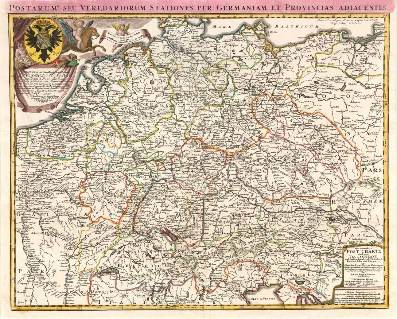 Post-Charte von Johann Peter Nell. Abb. aus: Johann Peter Nell u. Johann Baptist Homann, Neu-vermehrte Post-Charte durch gantz Teutschland nach Italien, Franckreich, Niederland, Preußen, Polen und Ungarn, Nürnberg 1714. (Bayerische Staatsbibliothek 2 Mapp. 8-3,1#8)