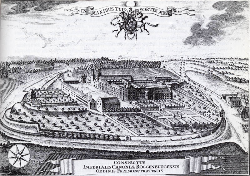 Roggenburg, Reichsabtei der Prämonstratenser. Stich von Johan Heinrich Störcklin, Augsburg, um 1722. (aus: Fischer-Flach, Maria u. Fischer, Wolfgang: Protokollbuch des Frauenklosters Unterzell bei Würzburg, Würzburg 1987, 241)
