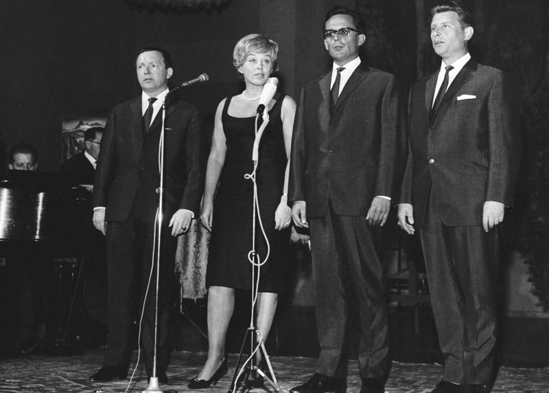 Mitglieder der Münchner Lach- und Schießgesellschaft bei der Preisvergabe Schwabinger Kunstpreis 1963 (v.l.n.r.): Hans-Jürgen Diedrich (1923–2012), Ursula Noack (1918–1988), Dieter Hildebrandt (1927–2013) und Jürgen Scheller (1922–1996). (Bayerische Staatsbibliothek, Bildarchiv timp-006800) HLB