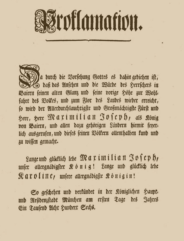 Proklamation über die Erhebung des Kurfürsten Maximilian Joseph von Bayern zum König, München 1806. (Bayerische Staatsbibliothek, 2 Bavar. 1401,III,4)