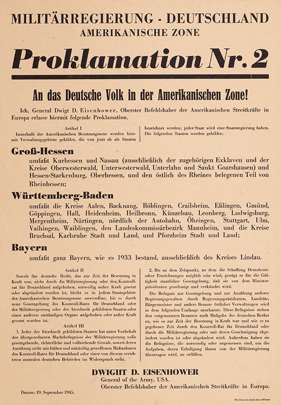 Proklamation Nr. 2: Am 19. September 1946 verkündete der Oberkommandierende der US-Streitkräfte, General Dwight D. Eisenhower (1890-1969, US-Präsident 1953-1961), die Errichtung der "Staaten" Großhessen, Württemberg-Baden und Bayern. (Landesarchiv Baden-Württemberg, J 151 Nr. 2647) HLB