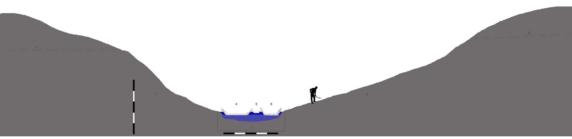 Idealisiertes Querprofil durch die tiefsten Bereiche des Kanals der Fossa Carolina, basierend auf Bohrungen und Grabungsbefunden. In der Fahrrinne Querschnitte zeitgenössischer Binnenschiffe. Abb. aus: Lukas Werther u. a., Fossata Magna – Kanäle des 1. Jahrtausends n. Chr., Mainz 2017. (Von Lukas Werther, Stefanie Berg, Peter Ettel, Sven Linzen, Johannes Schmidt und Christoph Zielhofer zur Verfügung gestellt)