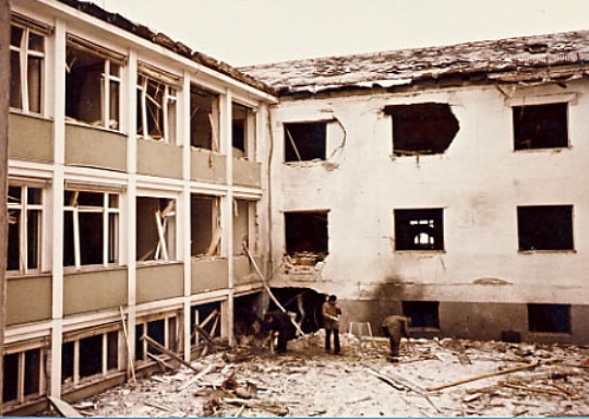 Am 21. Februar 1981 erfolgte der folgenschwerste Anschlag auf die Sendezentrale von Radio Free Europe in der Münchner Oettingenstraße. Sender und insbesondere Mitarbeiter waren immer wieder Übergriffen ausgesetzt. Konkrete Täter konnten nicht ermittelt werden. Bei dem Anschlag 1981 wurden drei Mitarbeiter schwer verletzt. Der betroffene Gebäudeteil musste in der Folge abgebrochen werden. Das Bild zeigt den Teil der Sendezentrale, der besonders schwer in Mitleidenschaft gezogen wurde. (Foto: privat)