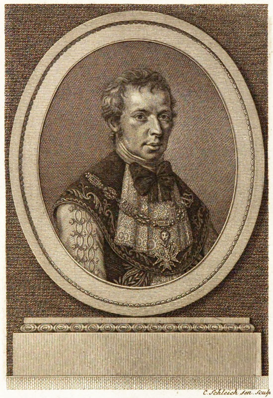 Aloys Graf von Rechberg (1776-1849), Bundestagsgesandter Bayerns 1816, Kupferstich von C. Schleich, 1832. Abb. aus: Wappen-Kalender des Kgl. Bayerischen Haus-Ritter-Ordens vom Heiligen Georg. München 1832. (Bayerische Staatsbibliothek, Bavar. 5200 u-1832) HLB