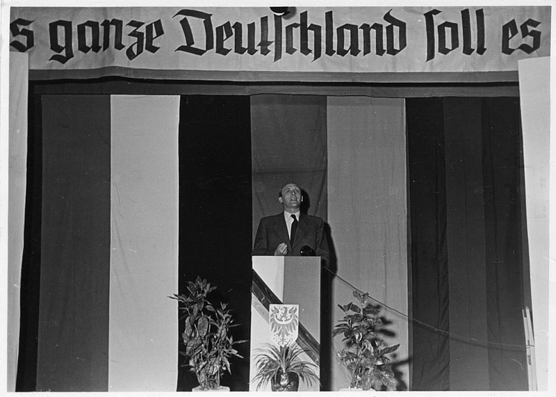 Dr. Walter Becher sprach am 14. Mai 1955 in Laufen a. d. Salzach anlässlich einer Kundgebung unter dem Motto "Das ganze Deutschland soll es sein!" zum zehnten Jahrestag des Beginns von Flucht und Vertreibung. (Bayerisches Hauptstaatsarchiv, sda.nl-becher_1531_0010)