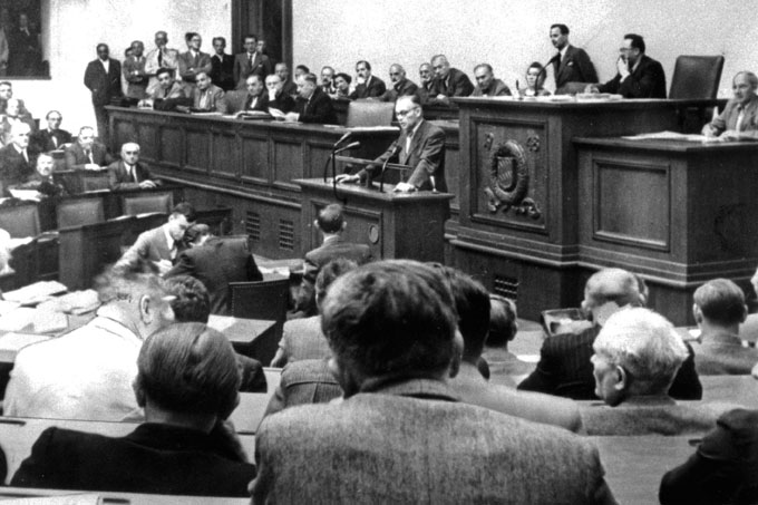 {{|1=Ministerpräsident Hans Ehard (CSU, bayerischer Ministerpräsident von 1946 bis 1954 sowie von 1960 bis 1962) begründet in der Plenarsitzung vom 19.5.1949 die Ablehnung des Grundgesetzes (©Bildarchiv Bayerischer Landtag, Bildnr. AA03320A).}}